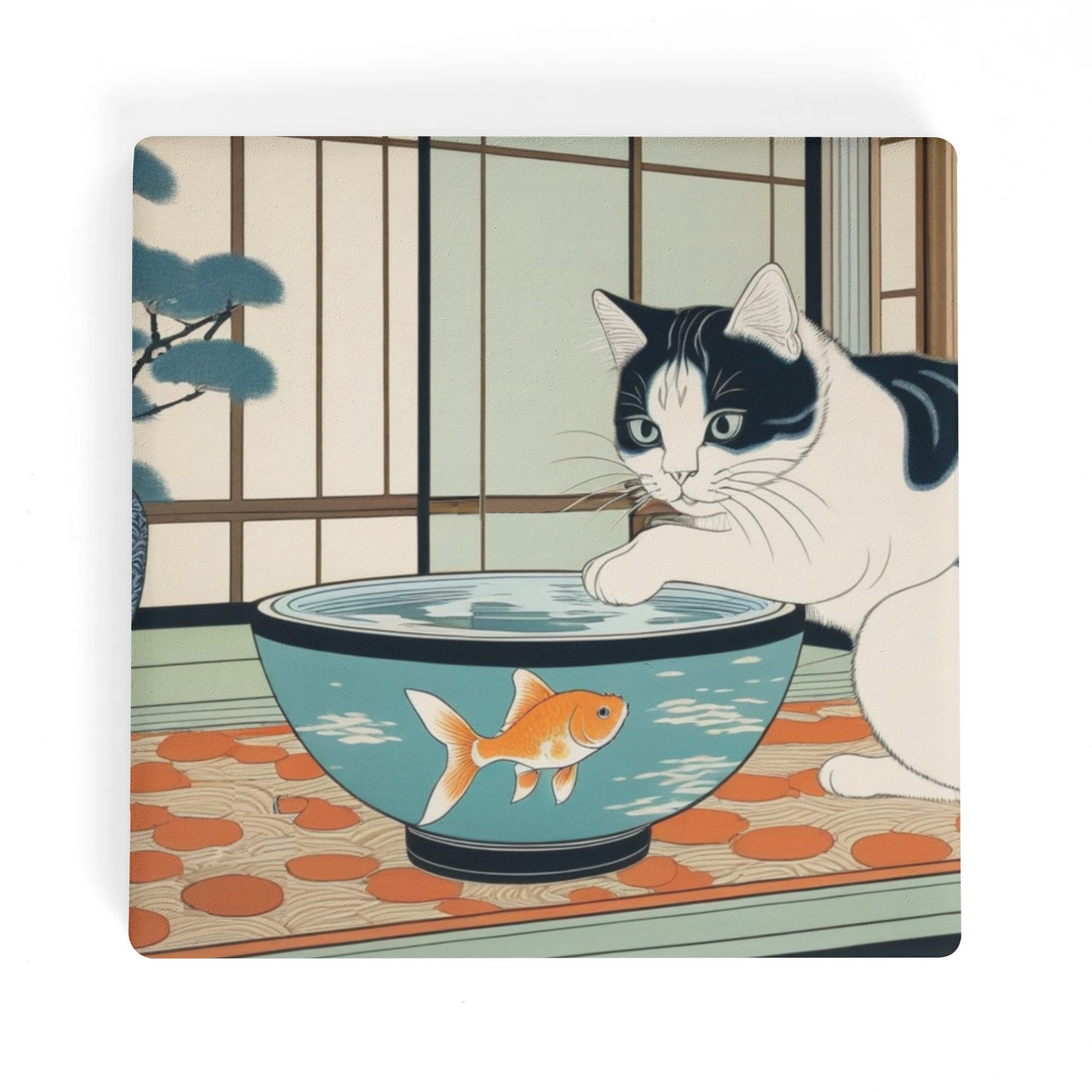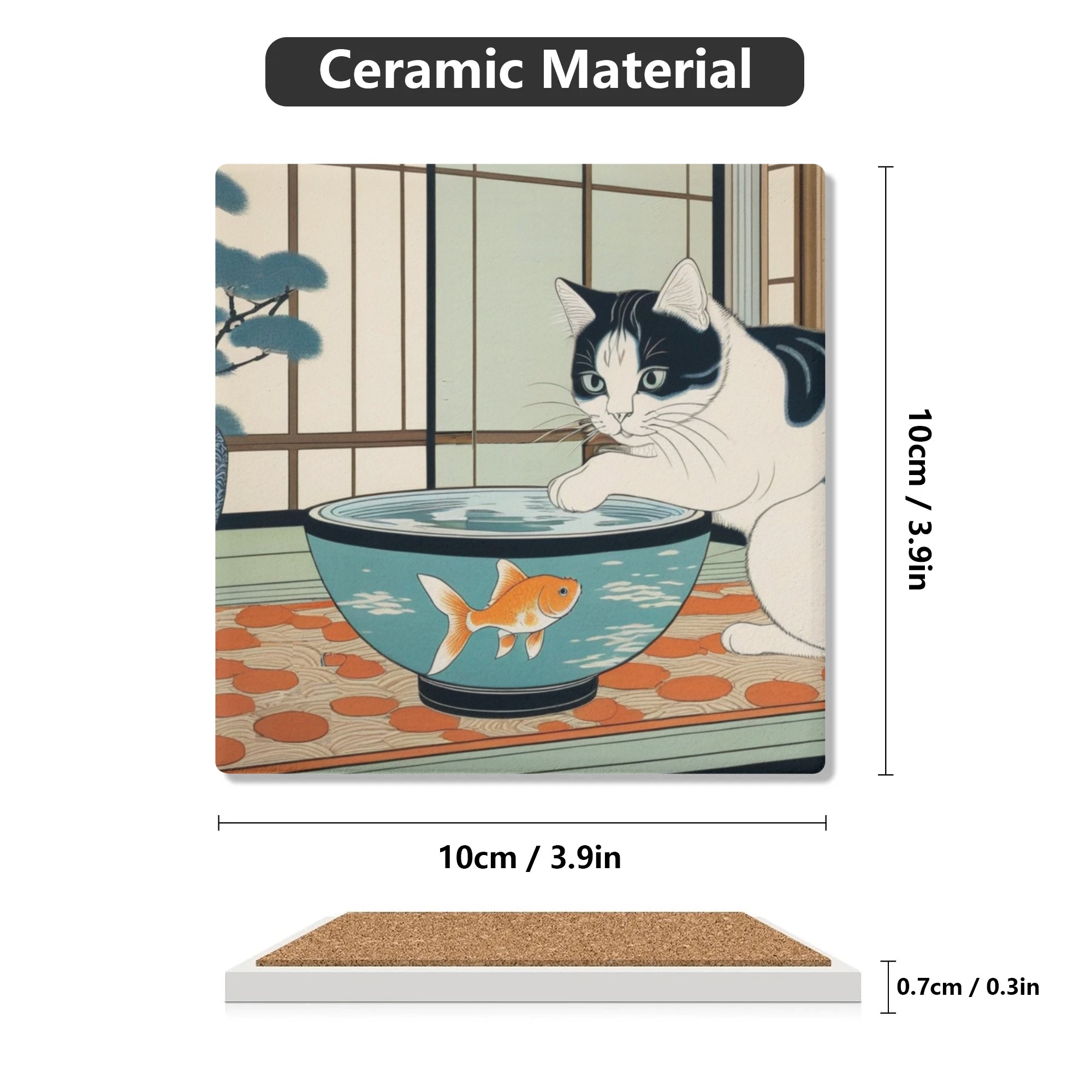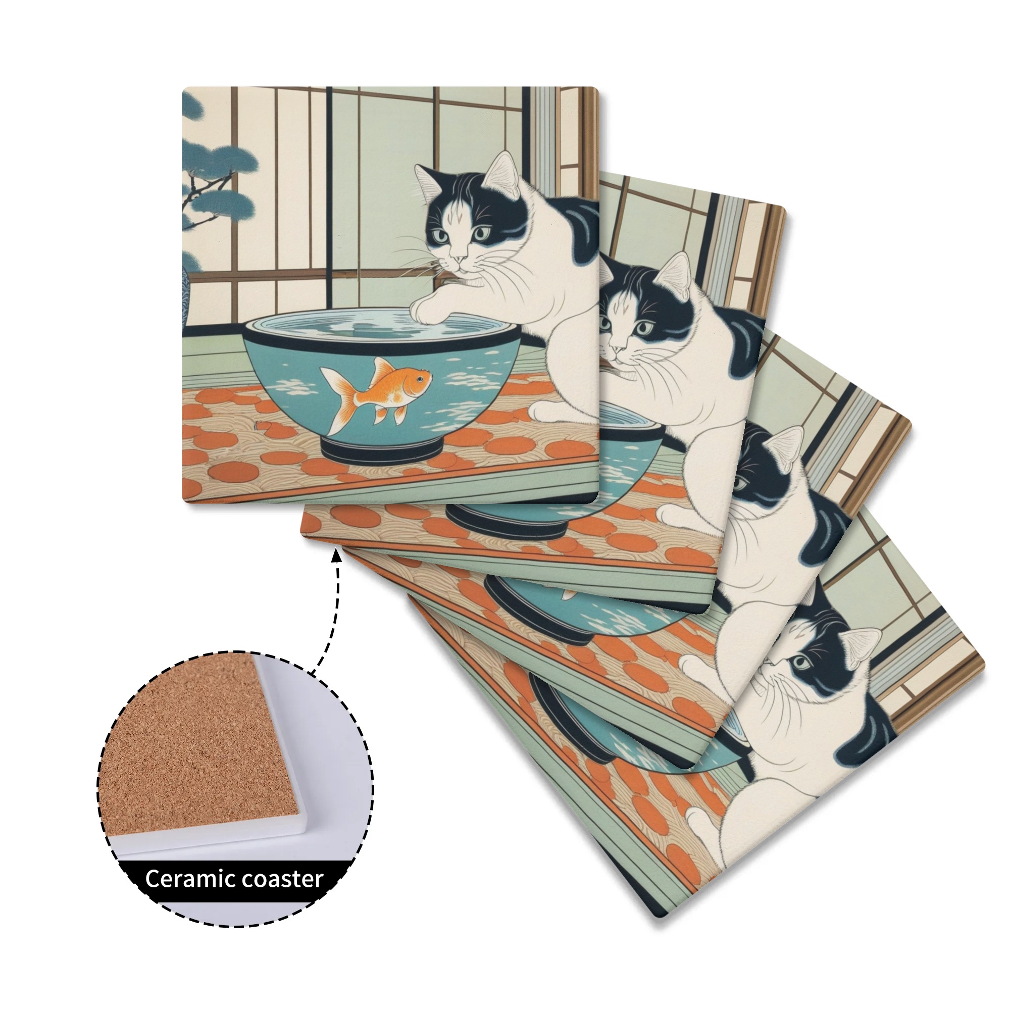 ※商品名:BONATHIA セラミックコースター leojiro24 和を感じる部屋の金魚鉢と好奇心旺盛な盛な白黒猫<br/><br/> <hr color='#FB5152' size='1'> <b>商品説明</b> <hr color='#FB5152' size='1'> * 環境に優しい高級感のあるセラミック素材のコースター<br/> * 4ピースセットで家族用、パーティーでも便利<br/> * サイズは10cm×10cm<br/> * 底はウッド素材の滑り止め加工で安定感抜群<br/> * 裏側には滑り止め加工<br/> * インテリアや小物置きとしても大活躍<br/> * お祝いやプレゼントにもおススメ<br/> <br/> <hr color='#FB5152' size='1'> <b>生産、配送期間</b> <hr color='#FB5152' size='1'> 生産期間:5~7日<br> EMS運送期間:生産終了後7~14日(最大)<br> <br/> <hr color='#FB5152' size='1'> <b>その他</b> <hr color='#FB5152' size='1'> ※完全受注生産のため発送までにお時間をいただいておりますがご了承ください。<br> ※アイテムの種類や素材によって仕上がりの色味に差異が生じる場合がありますのであらかじめご了承ください。<br> ※サイズは着用時の目安にご参考下さい。<br> ※入荷輸送時に、箱等に多少の汚れ・キズ・角凹みなどが発生する場合がございます。<br> ※上記ご了承の上、お買い求め下さい。<br>