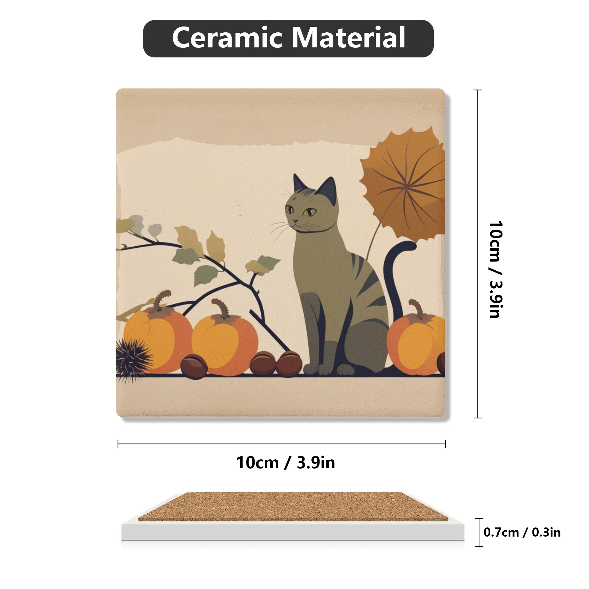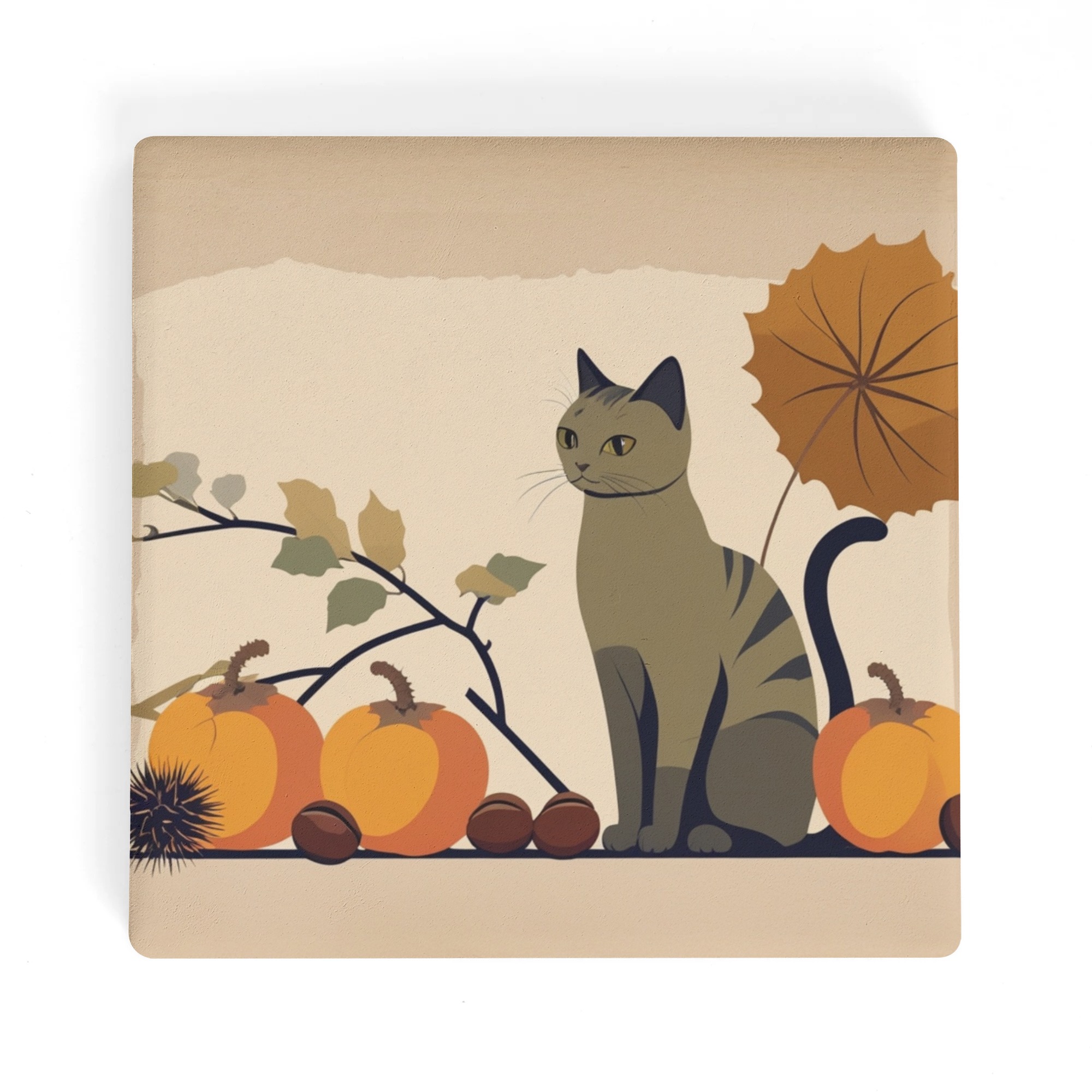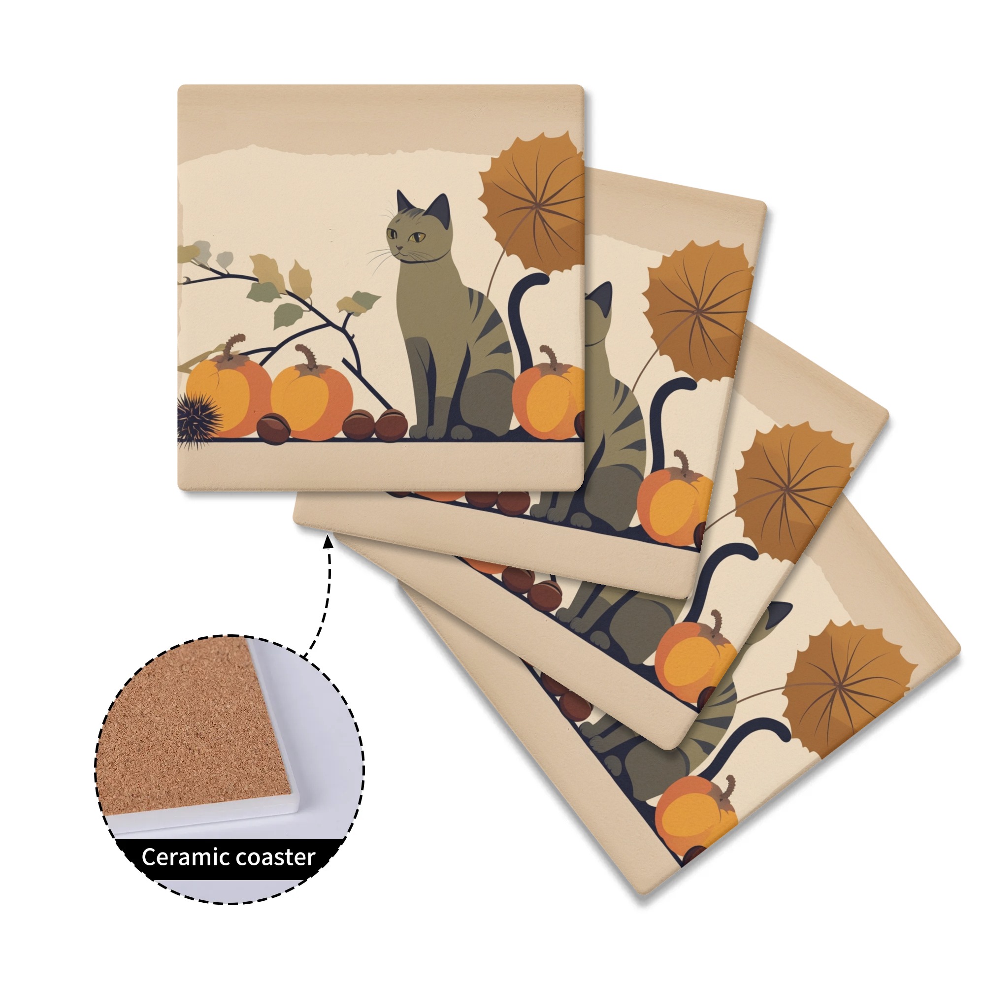 ※商品名:BONATHIA セラミックコースター leojiro24 猫と秋の楽しみ - 栗と柿のイラスト<br/><br/> <hr color='#FB5152' size='1'> <b>商品説明</b> <hr color='#FB5152' size='1'> * 環境に優しい高級感のあるセラミック素材のコースター<br/> * 4ピースセットで家族用、パーティーでも便利<br/> * サイズは10cm×10cm<br/> * 底はウッド素材の滑り止め加工で安定感抜群<br/> * 裏側には滑り止め加工<br/> * インテリアや小物置きとしても大活躍<br/> * お祝いやプレゼントにもおススメ<br/> <br/> <hr color='#FB5152' size='1'> <b>生産、配送期間</b> <hr color='#FB5152' size='1'> 生産期間:5~7日<br> EMS運送期間:生産終了後7~14日(最大)<br> <br/> <hr color='#FB5152' size='1'> <b>その他</b> <hr color='#FB5152' size='1'> ※完全受注生産のため発送までにお時間をいただいておりますがご了承ください。<br> ※アイテムの種類や素材によって仕上がりの色味に差異が生じる場合がありますのであらかじめご了承ください。<br> ※サイズは着用時の目安にご参考下さい。<br> ※入荷輸送時に、箱等に多少の汚れ・キズ・角凹みなどが発生する場合がございます。<br> ※上記ご了承の上、お買い求め下さい。<br>