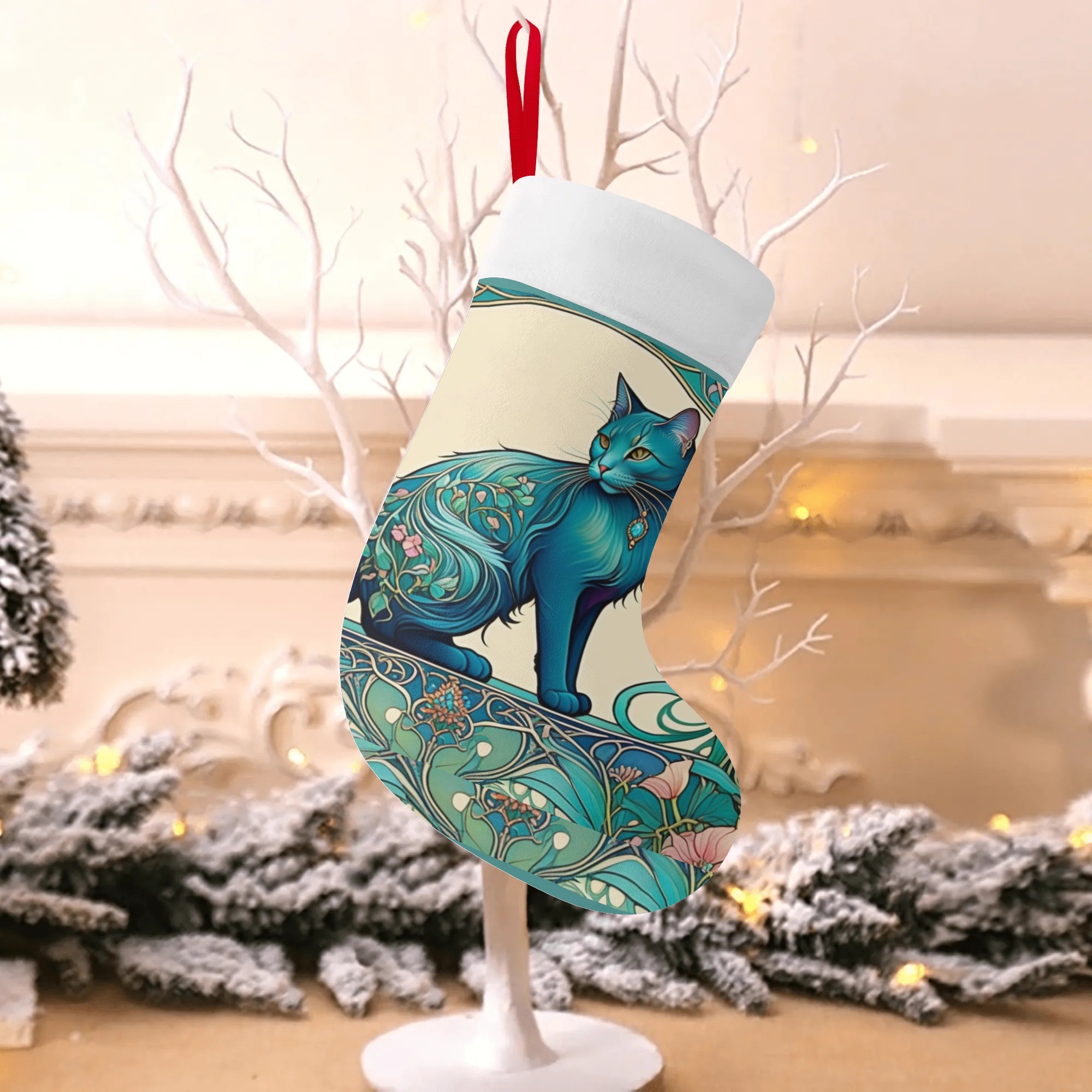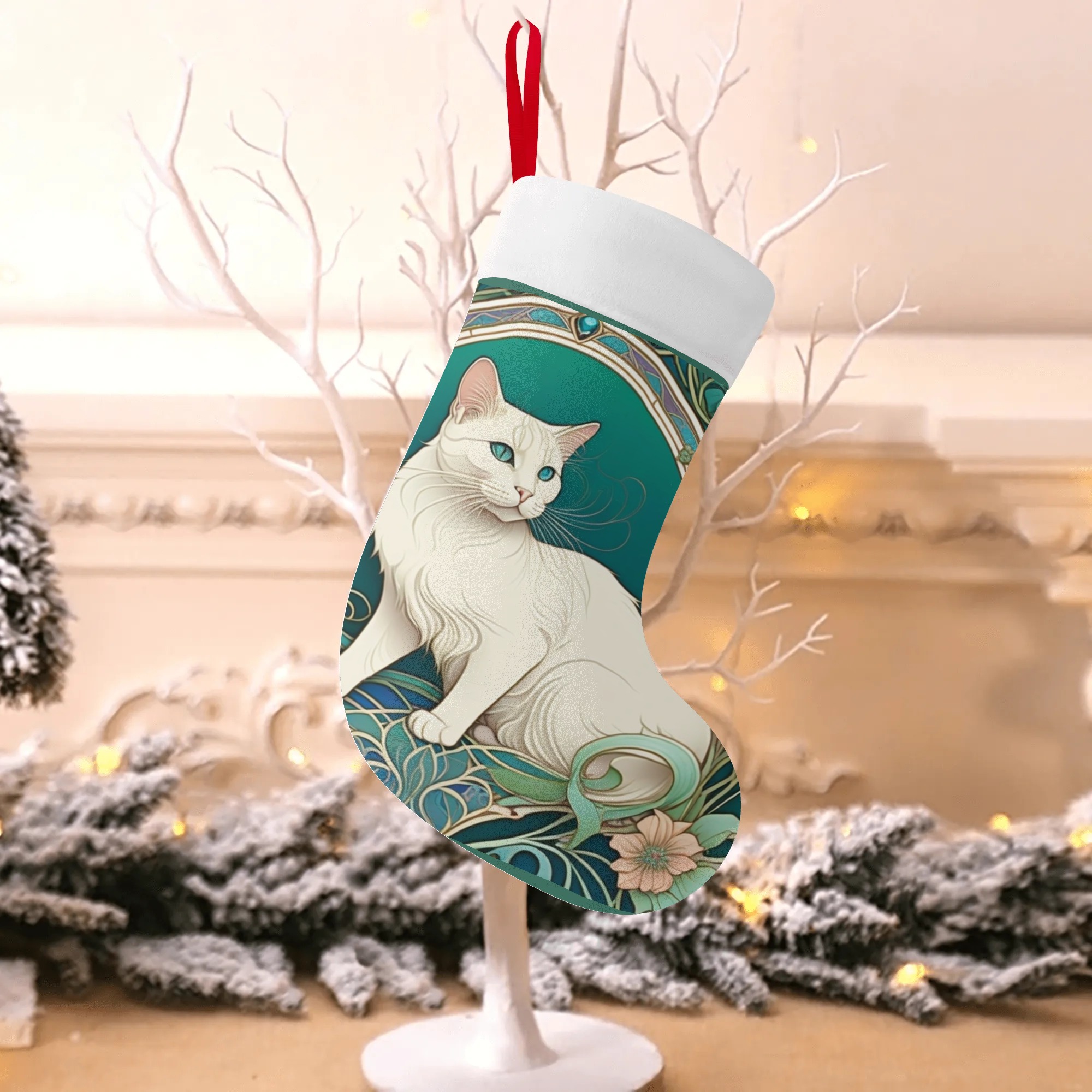 アールヌーボー様式の花柄模様の白猫